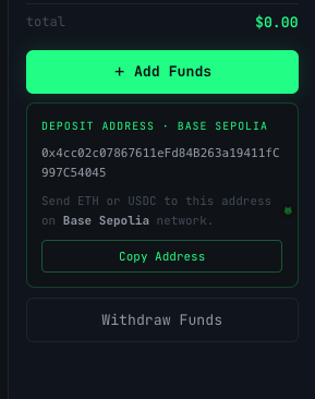 Copy the address using Copy Address and send ETH or USDC to it on the BASE network. Funds appear in your balance once the transaction is confirmed on-chain.