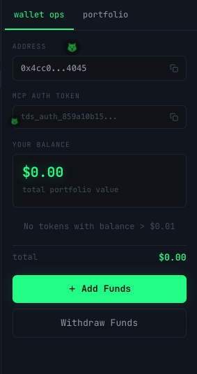 Wallet Ops panel — address, MCP auth token, balance breakdown