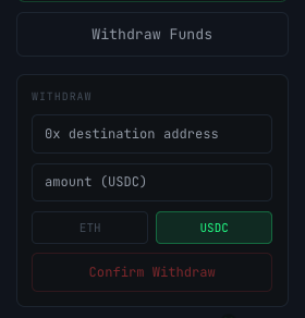 Enter your destination address, the amount to withdraw, and select ETH or USDC. Click Confirm Withdraw to execute. Withdrawals are dispatched on-chain and cannot be reversed once confirmed.